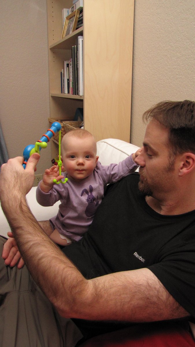 Too funny to see that both of our kids have enjoyed chewing on and playing with this lid from a block shape sorter box that was a gift from Granmommy :)